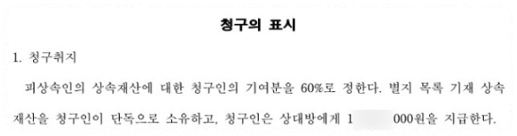 구체적인 청구취지는 아래와 같이 자신의 기여분을 60%로 인정해 줄것과 상속재산을 전부 자신의 소유로 하고, 의뢰인에게는 자신이 현금 1억원을 지급하는 방식으로 상속재산을 분할해달라 것이었습니다. .